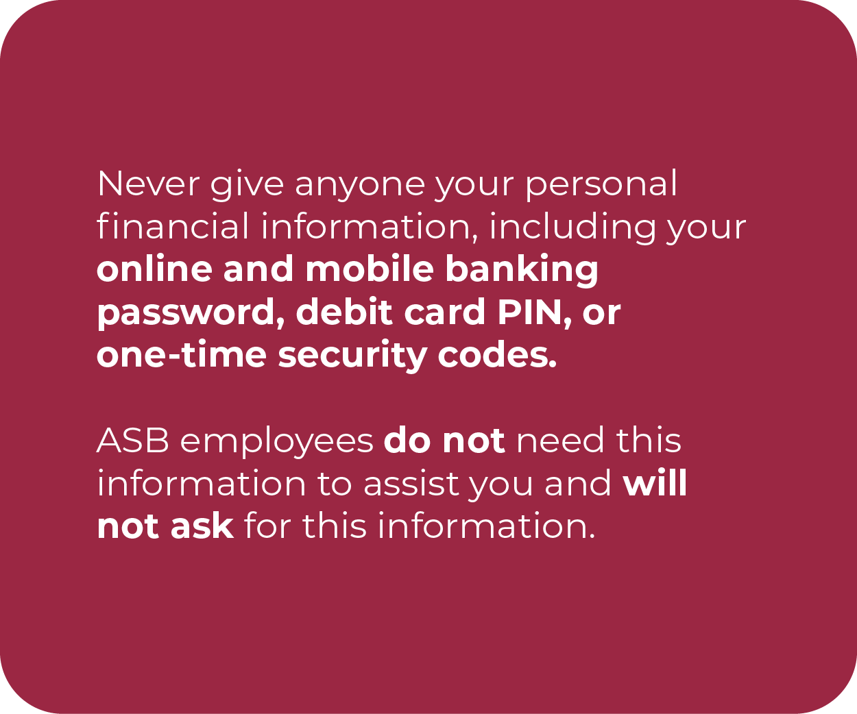 Information ASB will never ask for: