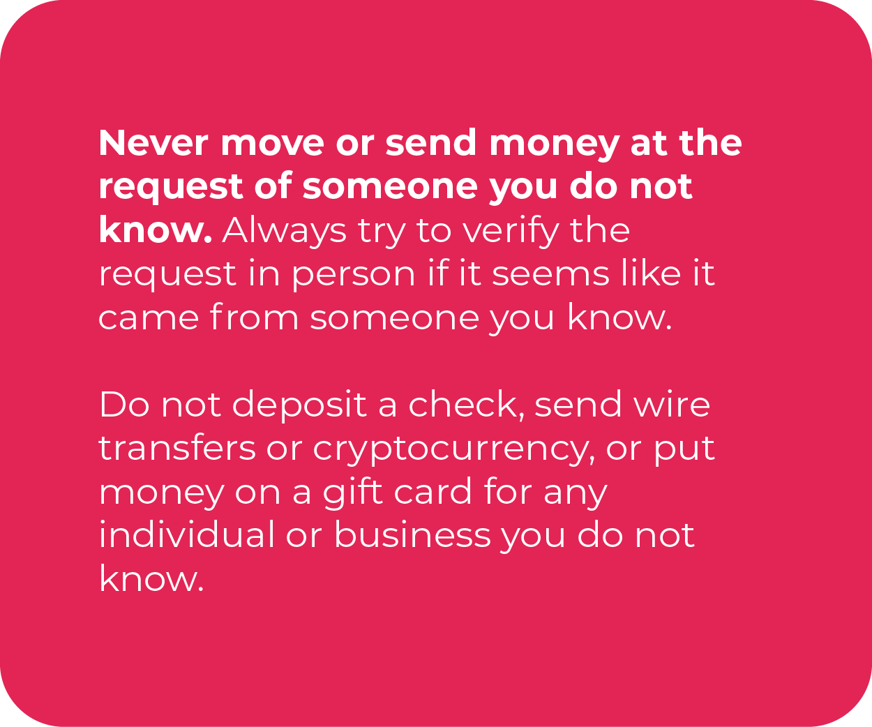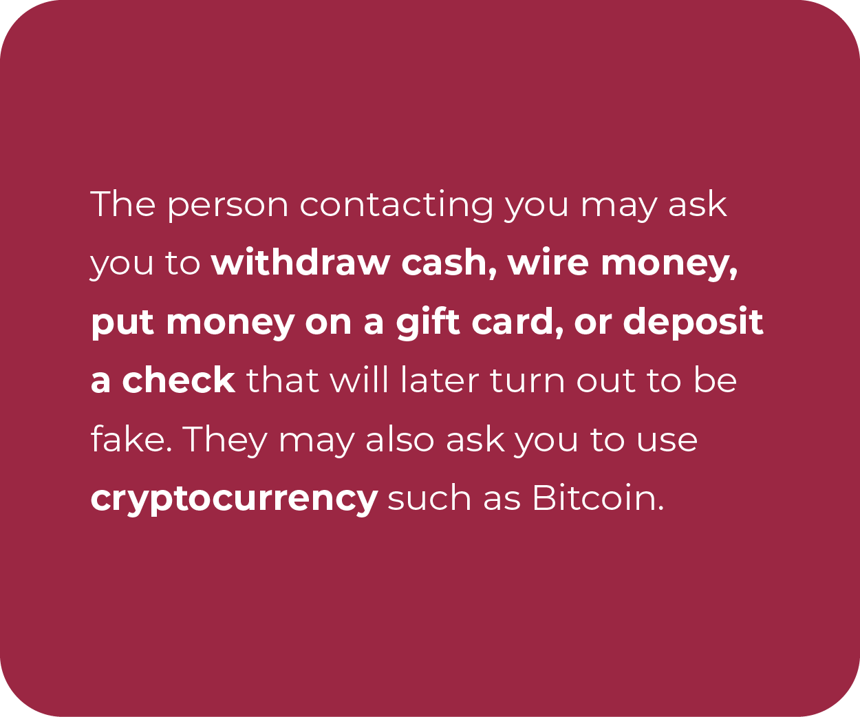 - Request checks, money orders, or cashier’s checks for payments.