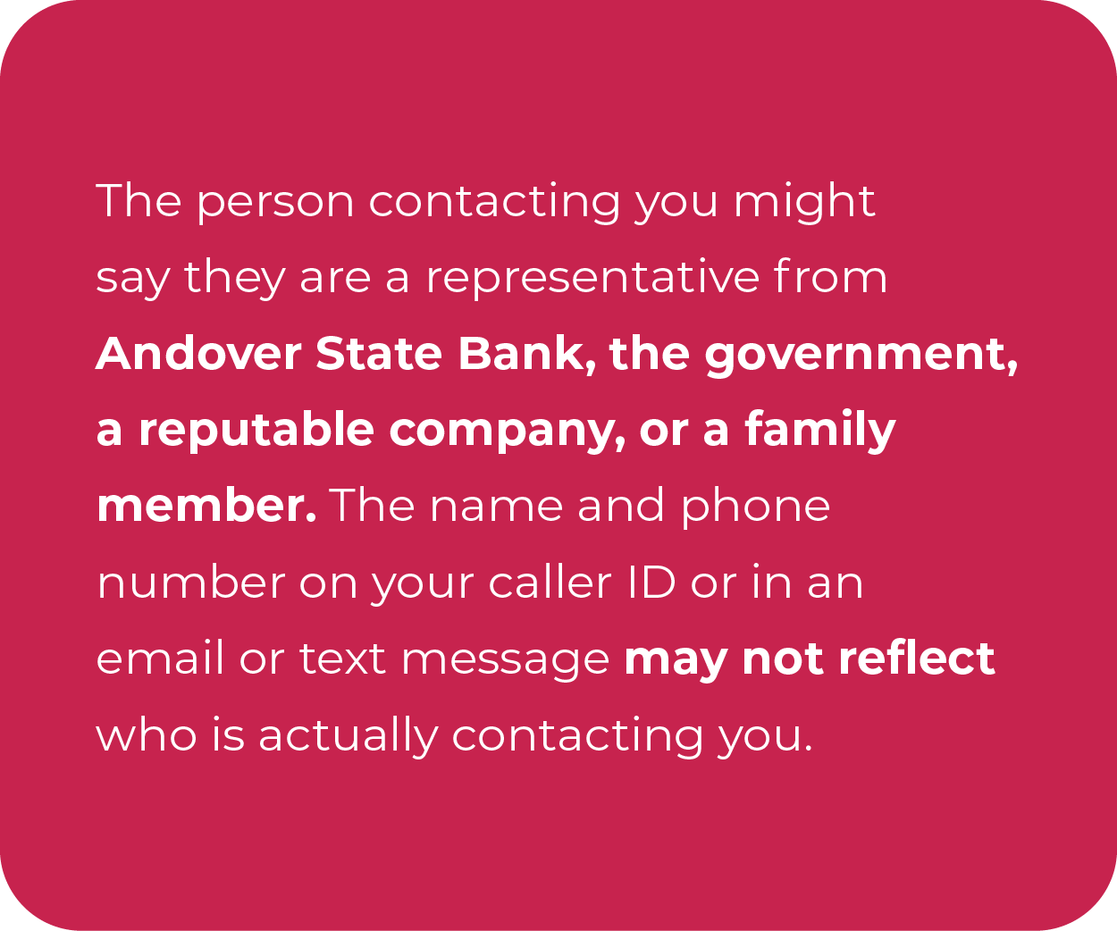 Be wary of scammers who attempt to impersonate Andover State Bank by identifying themselves as such or spoofing our phone number. It can be difficult to tell whether a call, email, or text message you receive is real or a scam, especially if it looks or sounds like it’s from a person or business you trust.